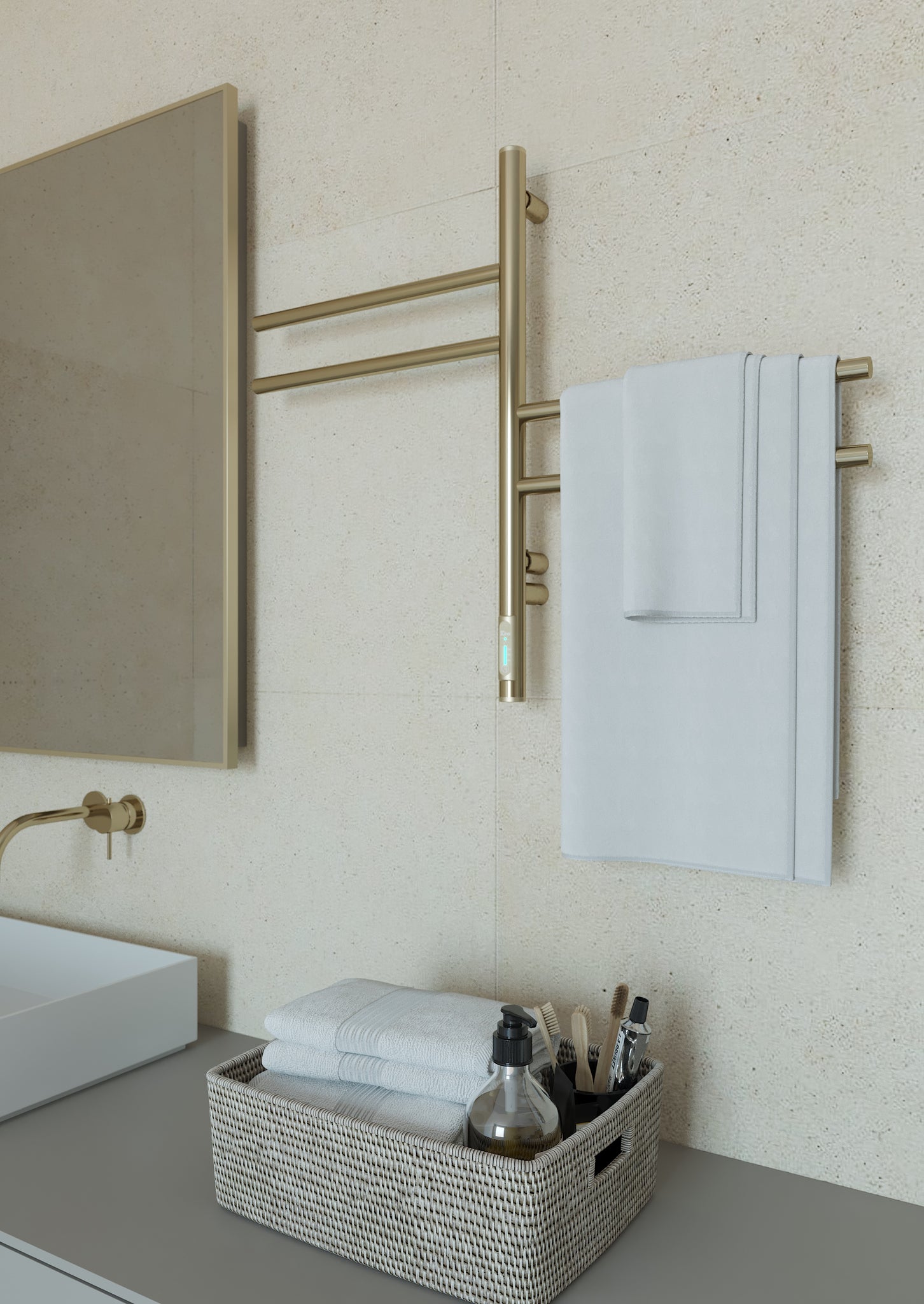 Vertical elektrinis rankšluosčių džiovintuvas – stilingas ir funkcionalus sprendimas kiekvienai voniai. Jame yra 4 judančios horizontalios dalys, kurios sukasi po 180° kampu – kiekviena nepriklausomai viena nuo kitos, todėl galima lengvai pritaikyti pagal individualius poreikius. Šis elektrinis įrenginys pagamintas iš nerūdijančio plieno ir padengtas aukštos kokybės PVD titano nitrido danga, kuri sukuria ilgaamžį apsauginį sluoksnį. PVD technologija užtikrina ne tik atsparumą, bet ir puikų estetinį rezultatą. Veidrodinis paviršiaus blizgesys ir šiltas aksominis aukso atspalvis suteikia gaminiui prabangos pojūtį bei puikiai dera prie modernaus ar klasikinio vonios kambario interjero.
