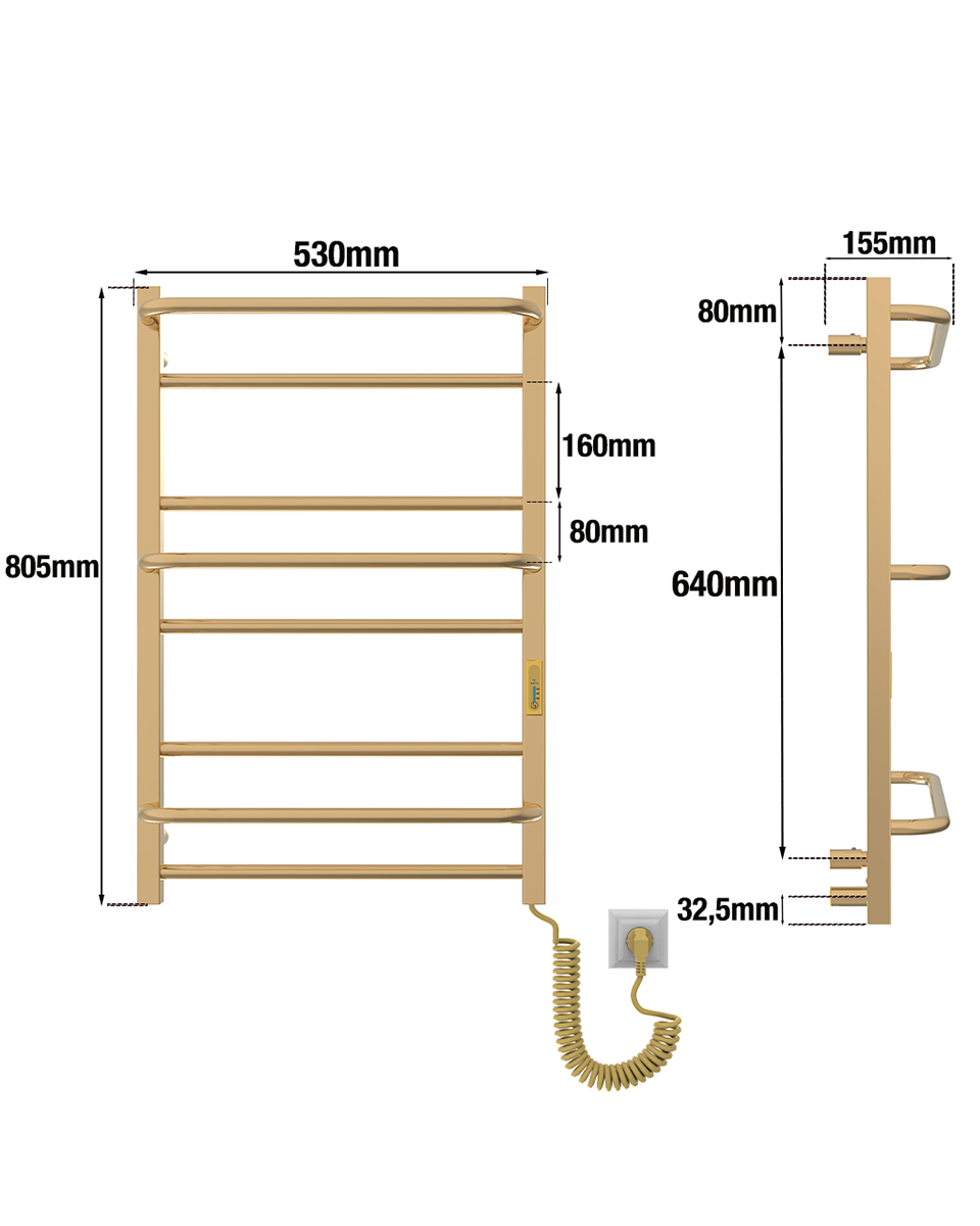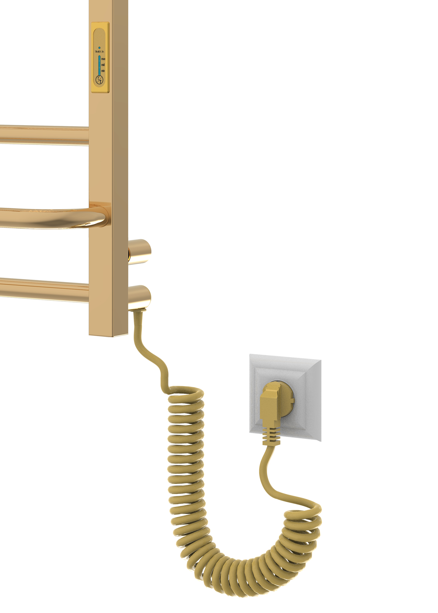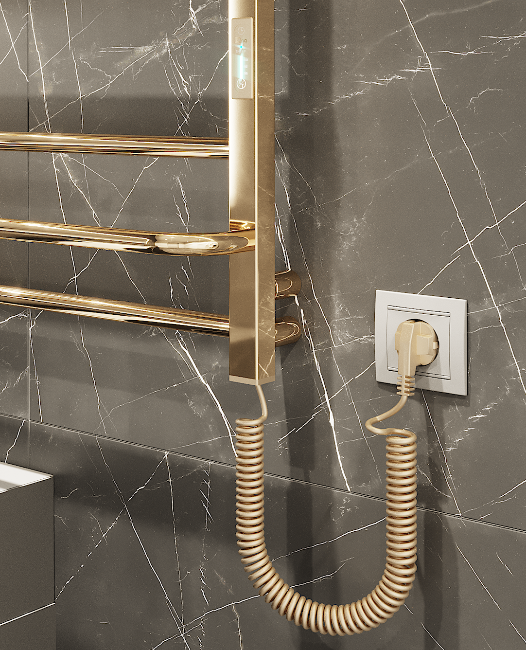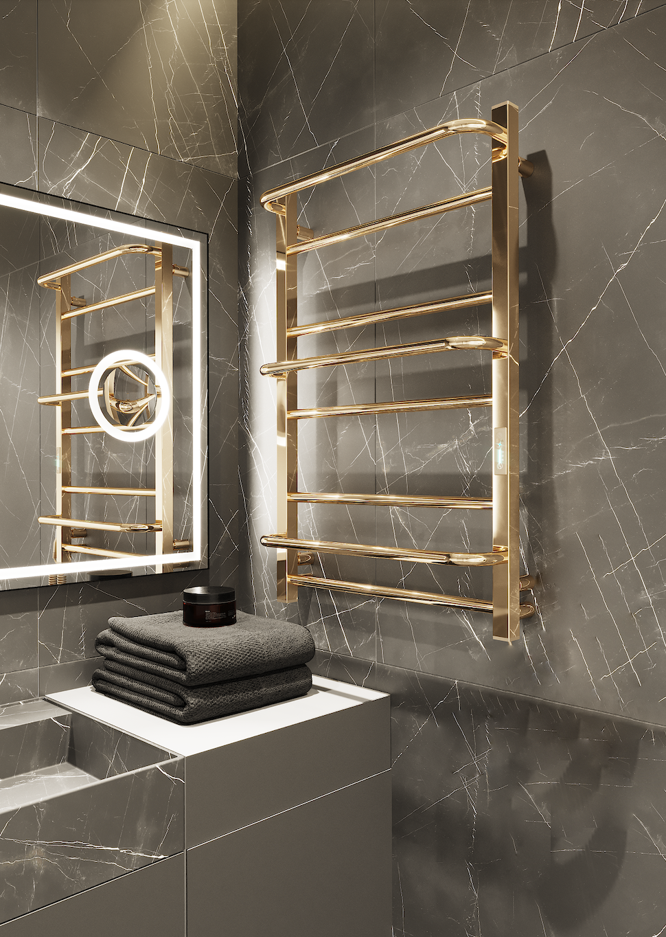 Anastasia elektrinis rankšluosčių džiovintuvas – stilingas ir funkcionalus sprendimas kiekvienai voniai. Šis elektrinis įrenginys pagamintas iš nerūdijančio plieno ir padengtas aukštos kokybės PVD titano nitrido danga, kuri sukuria ilgaamžį apsauginį sluoksnį. PVD technologija užtikrina ne tik atsparumą, bet ir puikų estetinį rezultatą. Veidrodinis paviršiaus blizgesys ir šiltas aksominis aukso atspalvis suteikia gaminiui prabangos pojūtį bei puikiai dera prie modernaus ar klasikinio vonios kambario interjero.