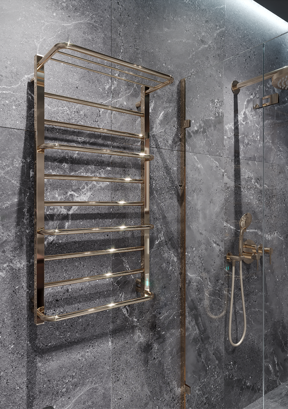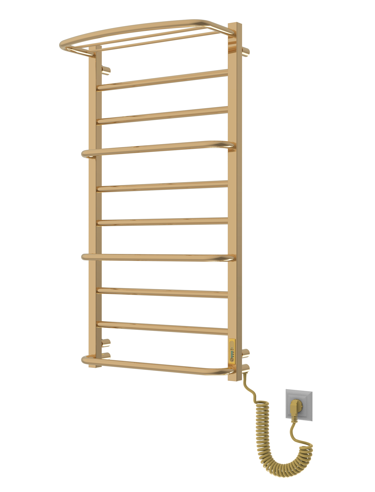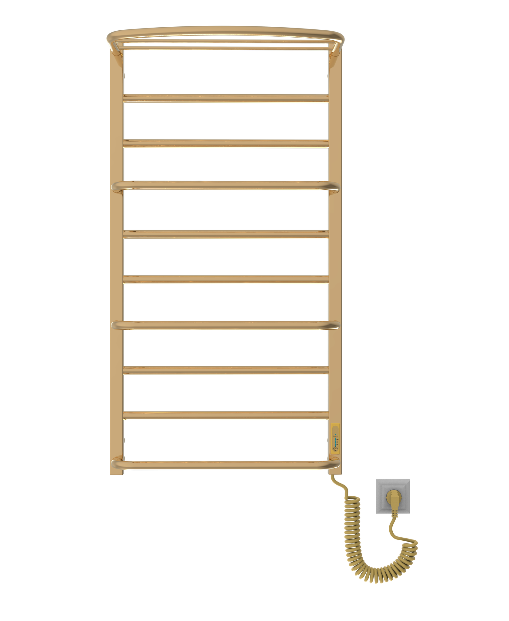Cascade Lux with Shelf elektrinis rankšluosčių džiovintuvas – stilingas ir funkcionalus sprendimas kiekvienai voniai. Šis elektrinis įrenginys pagamintas iš nerūdijančio plieno ir padengtas aukštos kokybės PVD titano nitrido danga, kuri sukuria ilgaamžį apsauginį sluoksnį. PVD technologija užtikrina ne tik atsparumą, bet ir puikų estetinį rezultatą. Veidrodinis paviršiaus blizgesys ir šiltas aksominis aukso atspalvis suteikia gaminiui prabangos pojūtį bei puikiai dera prie modernaus ar klasikinio vonios kambario interjero.