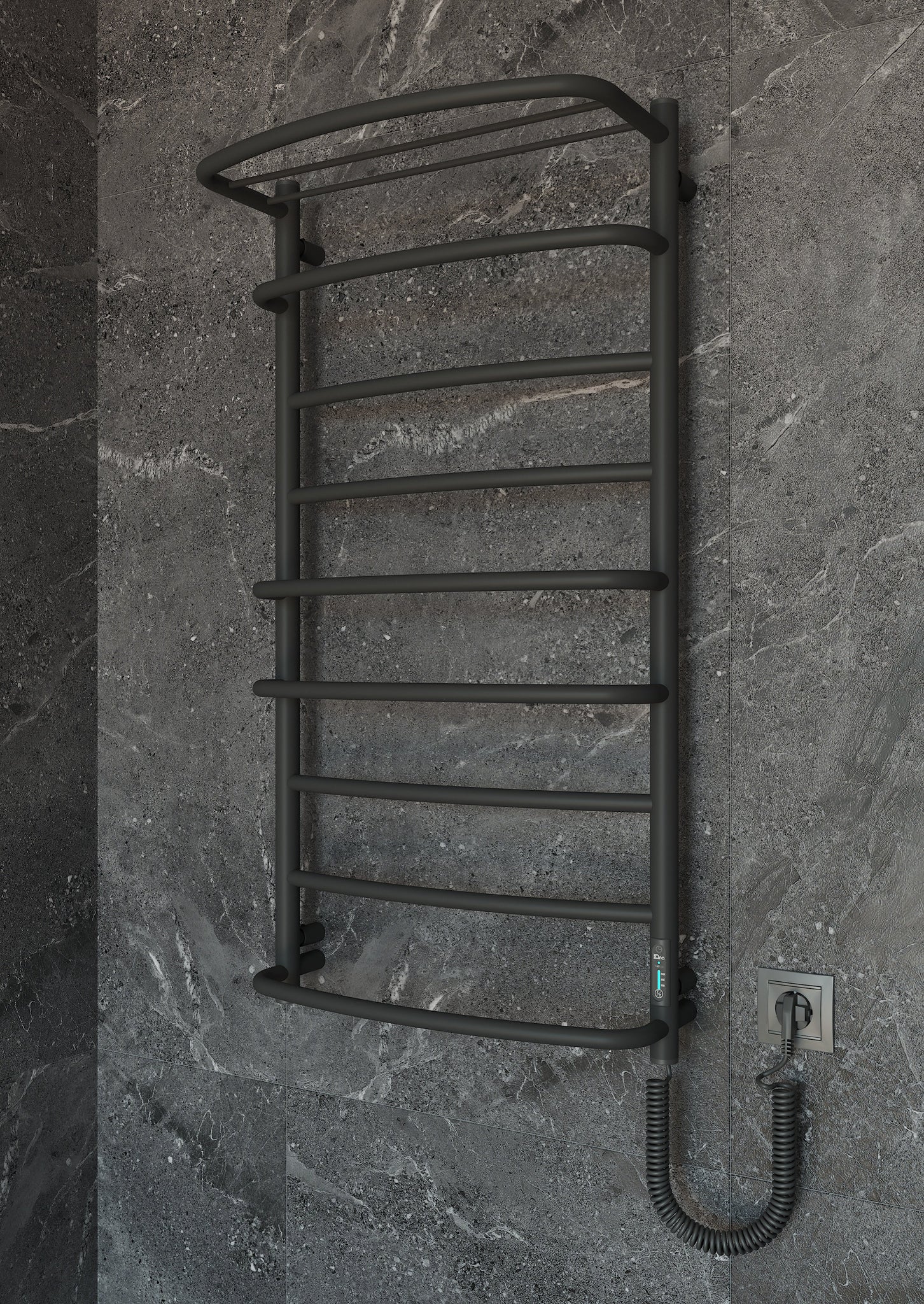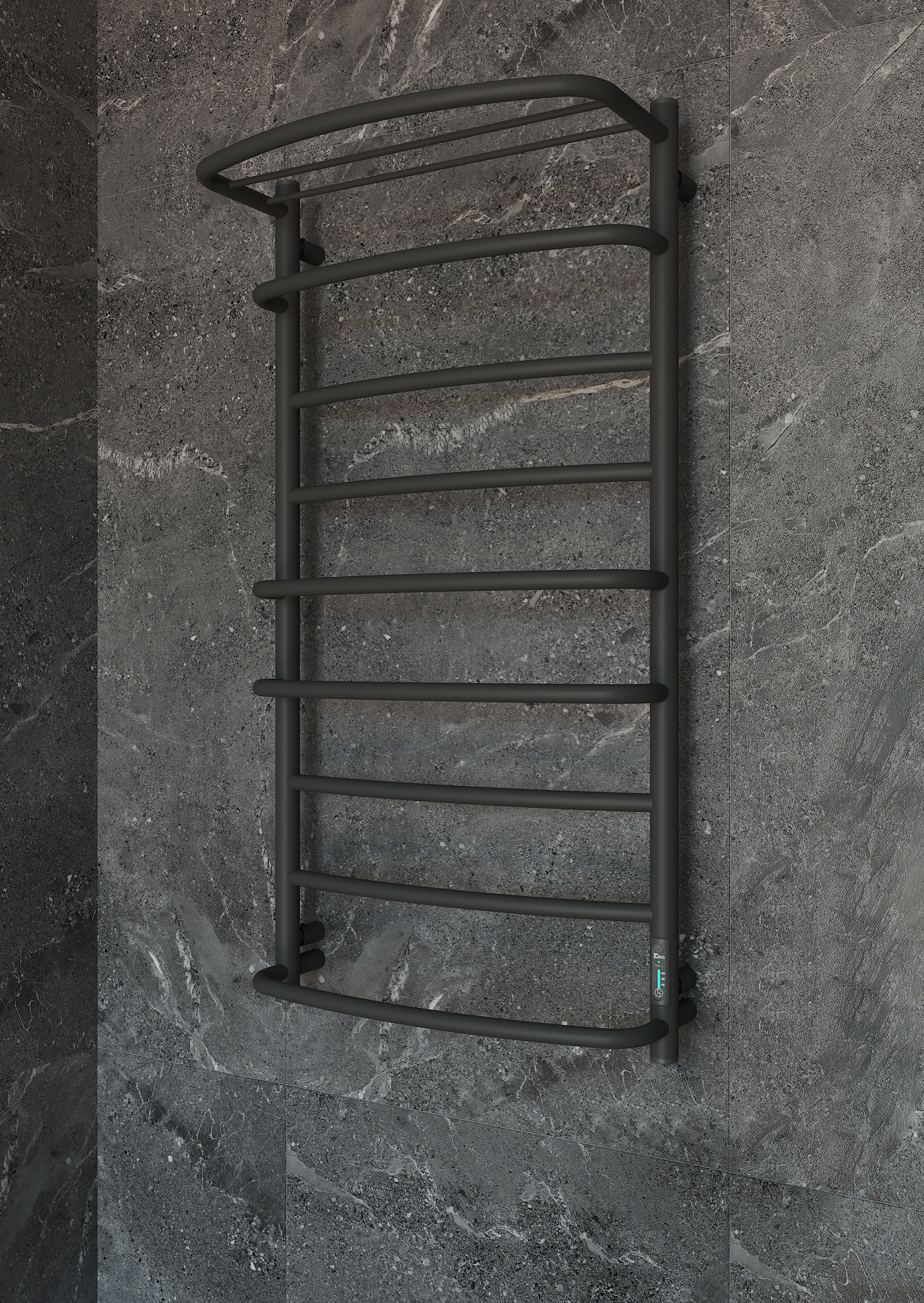 Cascade with Shelf elektrinis rankšluosčių džiovintuvas, pagamintas iš polimerinių medžiagų ir padengtas milteliniais dažais, yra funkcionalus ir modernus sprendimas kiekvienai voniai.