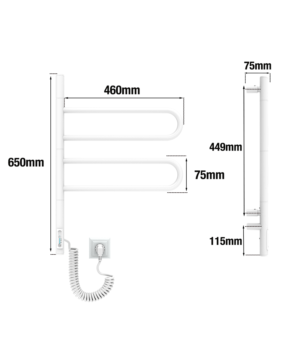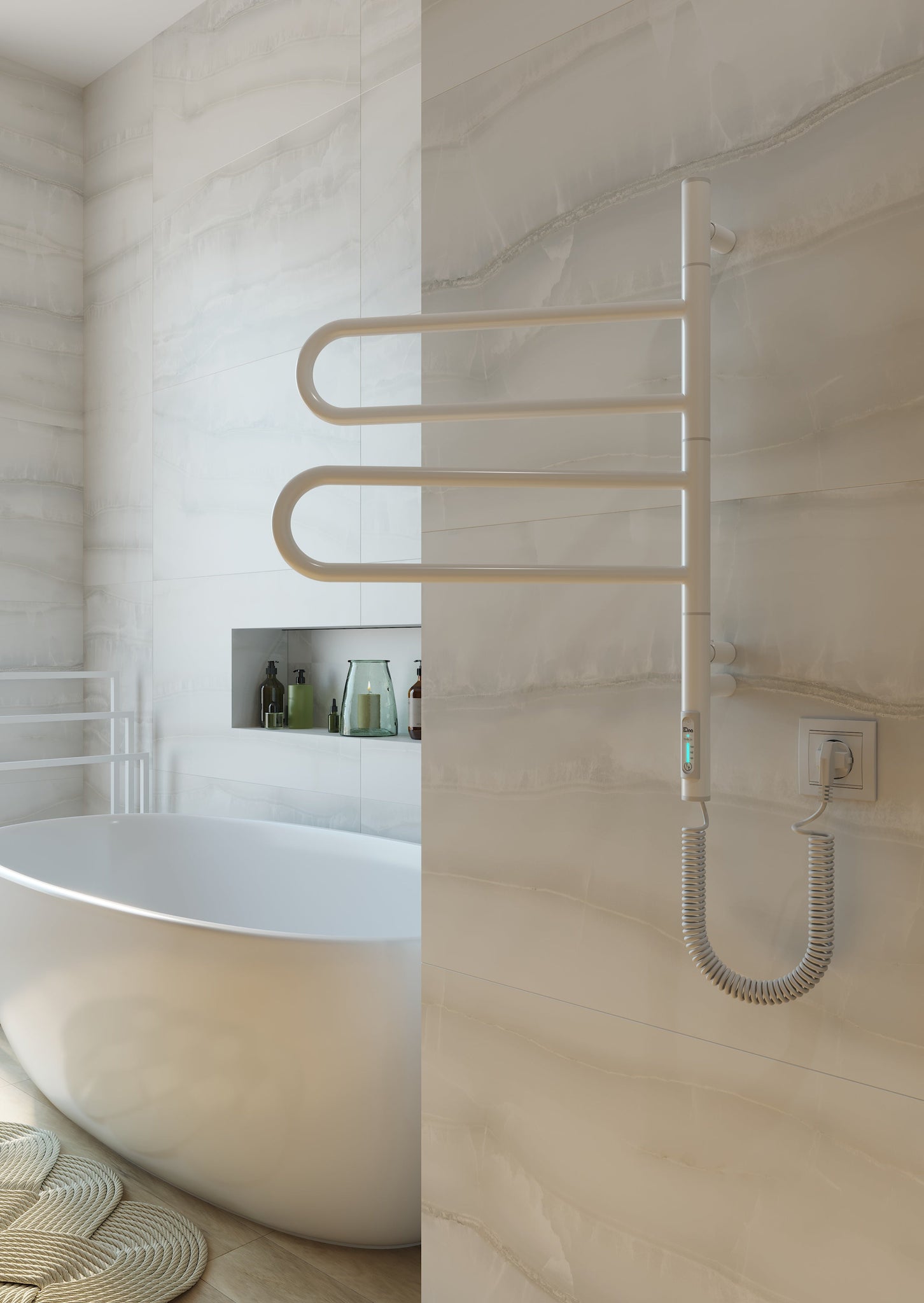 Tai visiškai elektrinis įrenginys, kuris neveikia vandens pagrindu ir nereikalauja prijungimo prie centrinės šildymo sistemos. Radiatorių galima įrengti bet kur, kur yra elektros lizdas – tiek kairėje, tiek dešinėje pusėje, pagal Jūsų poreikį. Viduje esantis sausasis šildymo laidas užtikrina saugų ir greitą veikimą – be jokių skysčių, tiesiog prijunkite prie elektros ir jis įkaista per kelias minutes. Tai ypač patogu, kai reikia greitai išdžiovinti rankšluosčius ar pašildyti juos jaukiam pojūčiui po dušo ar vonios.