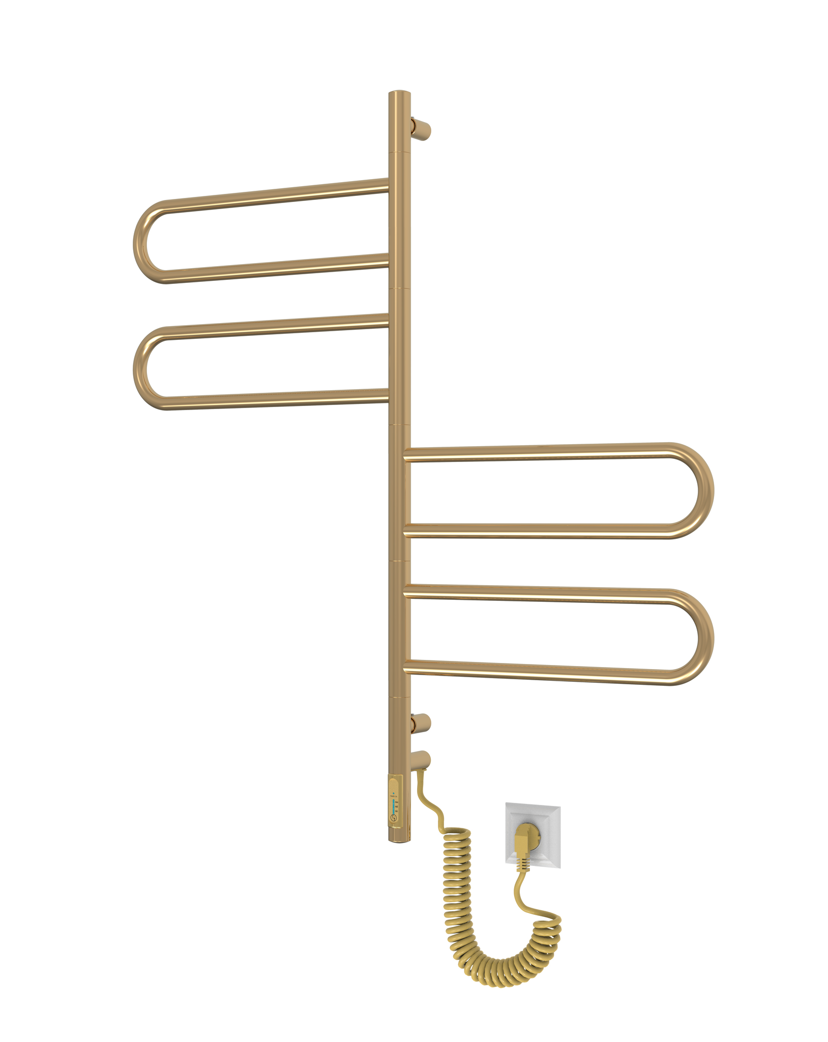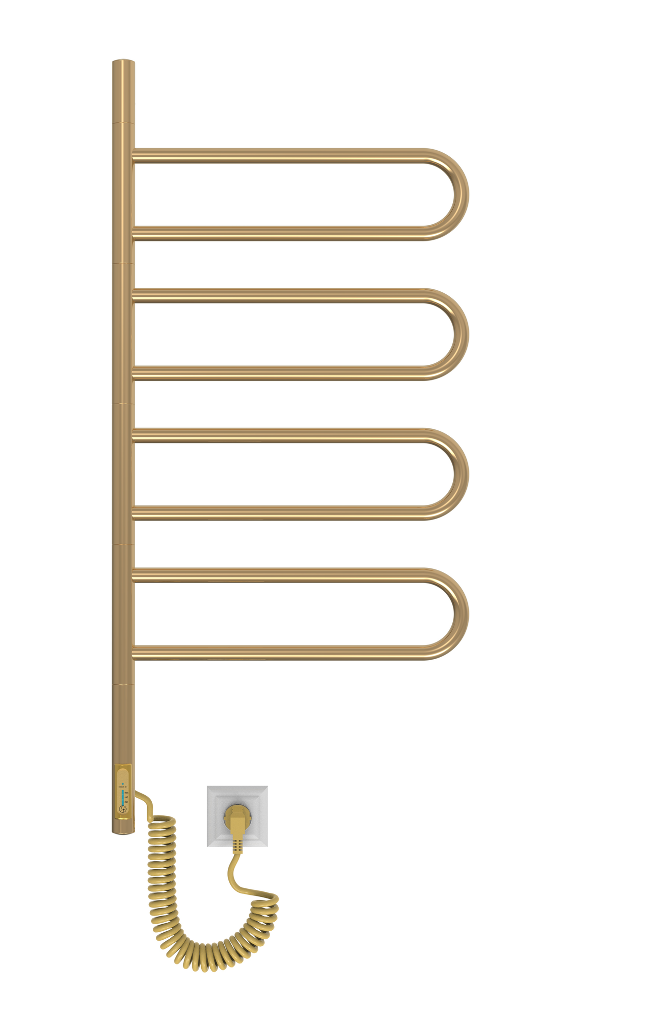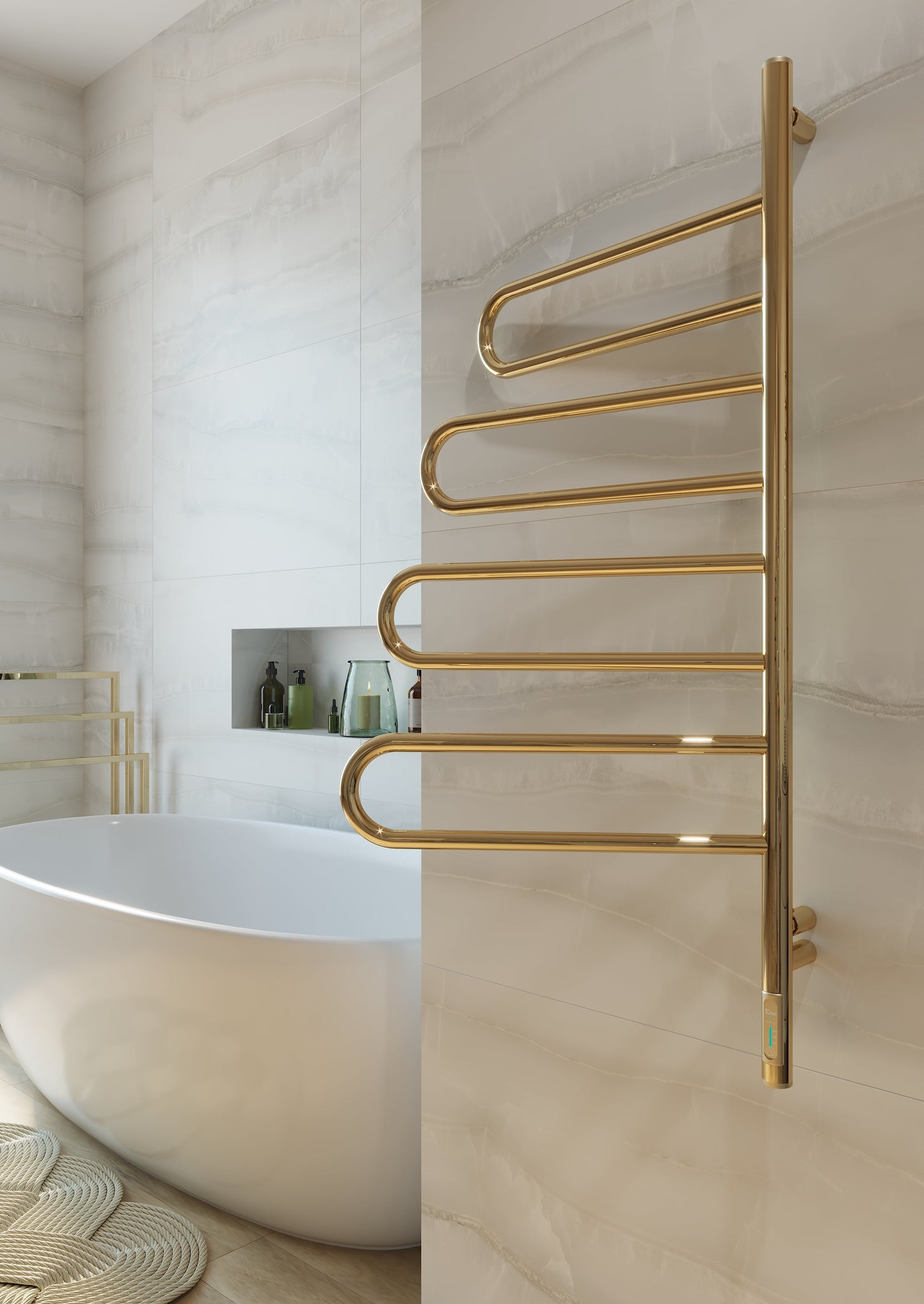 Fluger elektrinis rankšluosčių džiovintuvas – stilingas ir funkcionalus sprendimas kiekvienai voniai. Jame yra 4 judančios horizontalios dalys, kurios sukasi po 180° kampu – kiekviena nepriklausomai viena nuo kitos, todėl galima lengvai pritaikyti pagal individualius poreikius. Šis elektrinis įrenginys pagamintas iš nerūdijančio plieno ir padengtas aukštos kokybės PVD titano nitrido danga, kuri sukuria ilgaamžį apsauginį sluoksnį. PVD technologija užtikrina ne tik atsparumą, bet ir puikų estetinį rezultatą. Veidrodinis paviršiaus blizgesys ir šiltas aksominis aukso atspalvis suteikia gaminiui prabangos pojūtį bei puikiai dera prie modernaus ar klasikinio vonios kambario interjero.