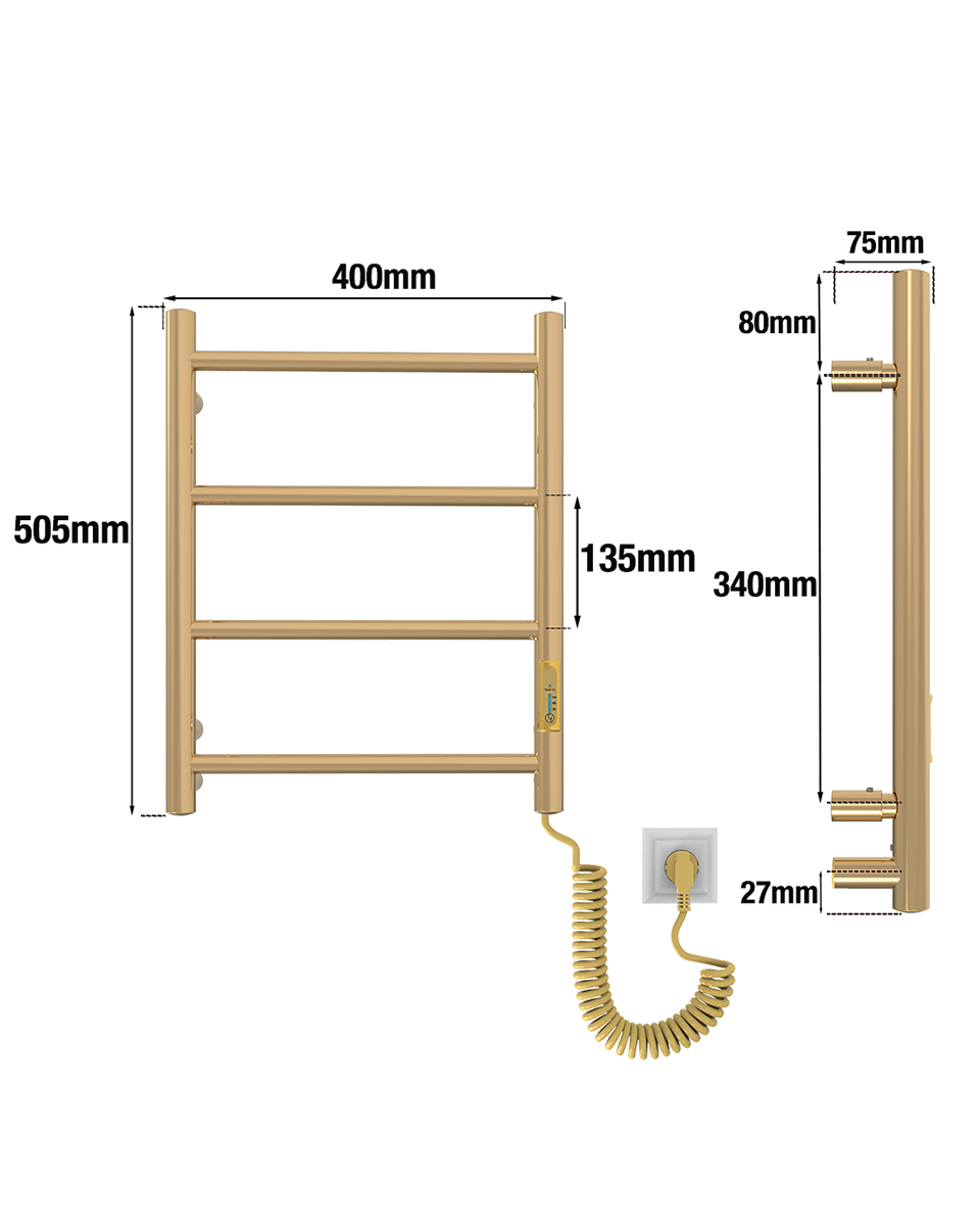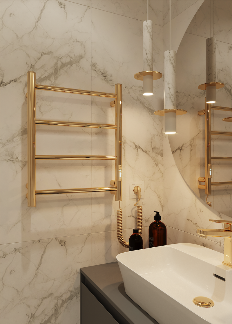 Ladder elektrinis rankšluosčių džiovintuvas – stilingas ir funkcionalus sprendimas kiekvienai voniai. Šis elektrinis įrenginys pagamintas iš nerūdijančio plieno ir padengtas aukštos kokybės PVD titano nitrido danga, kuri sukuria ilgaamžį apsauginį sluoksnį. PVD technologija užtikrina ne tik atsparumą, bet ir puikų estetinį rezultatą. Veidrodinis paviršiaus blizgesys ir šiltas aksominis aukso atspalvis suteikia gaminiui prabangos pojūtį bei puikiai dera prie modernaus ar klasikinio vonios kambario interjero.