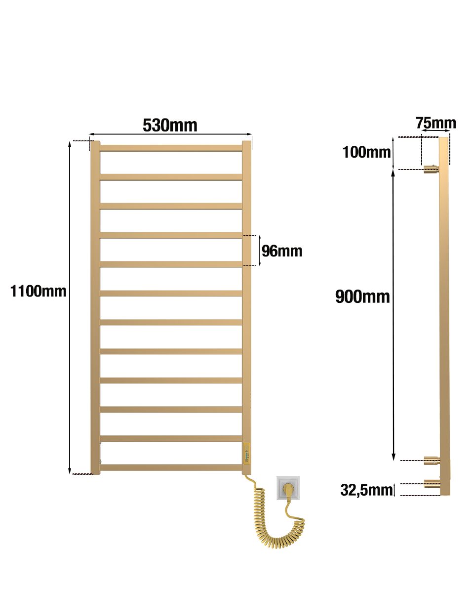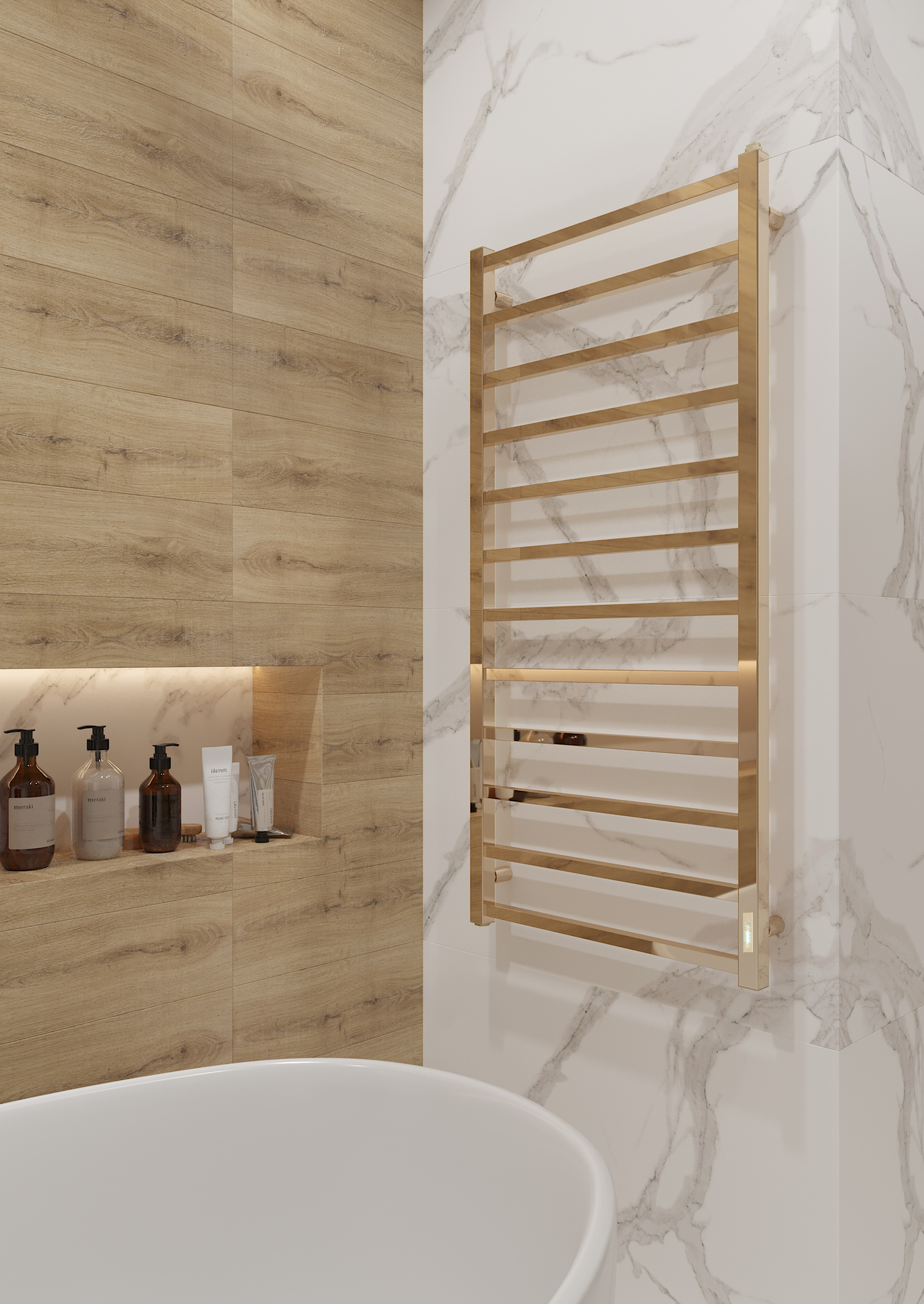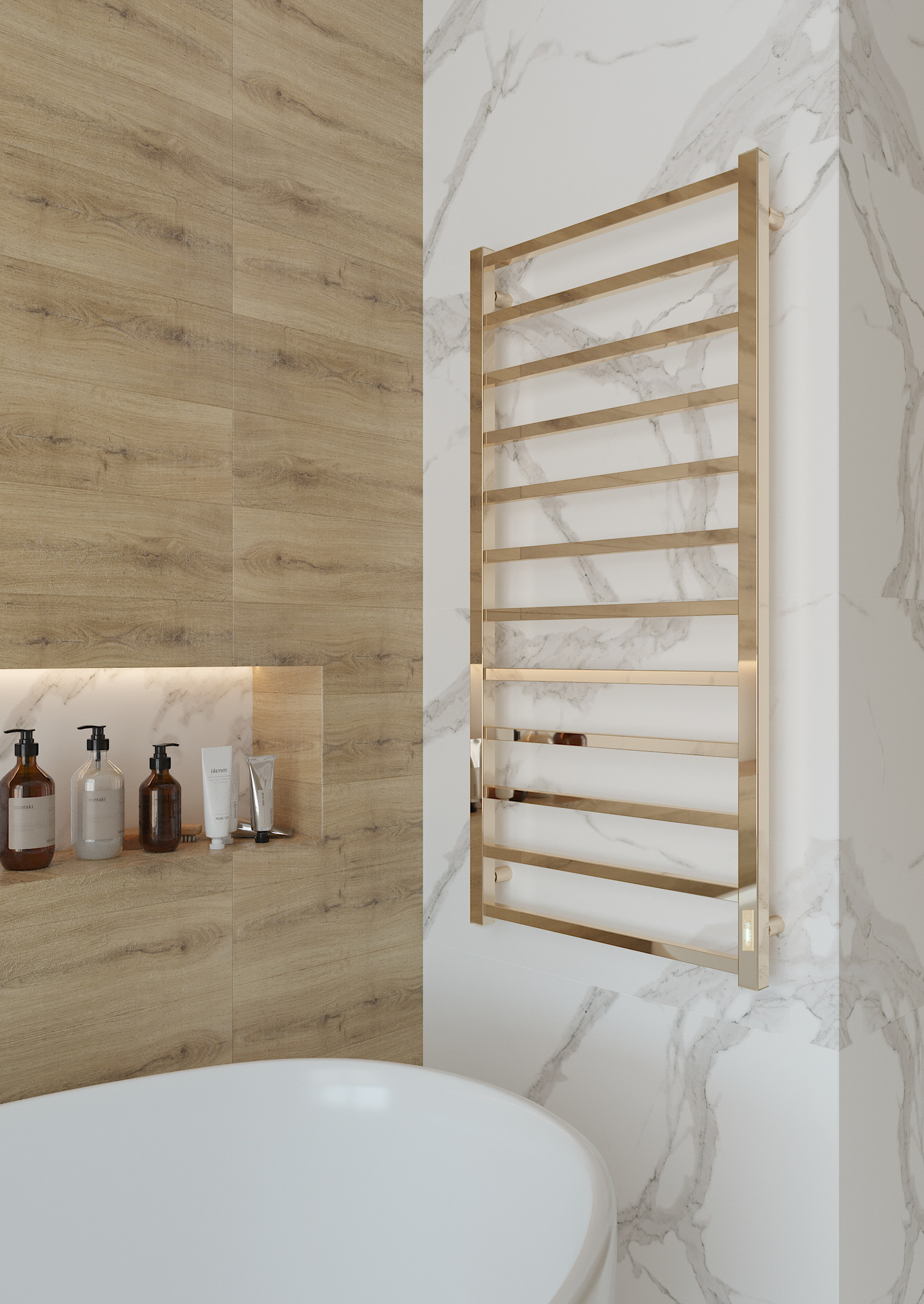 Ladder Elite elektrinis rankšluosčių džiovintuvas – stilingas ir funkcionalus sprendimas kiekvienai voniai. Šis elektrinis įrenginys pagamintas iš nerūdijančio plieno ir padengtas aukštos kokybės PVD titano nitrido danga, kuri sukuria ilgaamžį apsauginį sluoksnį. PVD technologija užtikrina ne tik atsparumą, bet ir puikų estetinį rezultatą. Veidrodinis paviršiaus blizgesys ir šiltas aksominis aukso atspalvis suteikia gaminiui prabangos pojūtį bei puikiai dera prie modernaus ar klasikinio vonios kambario interjero.