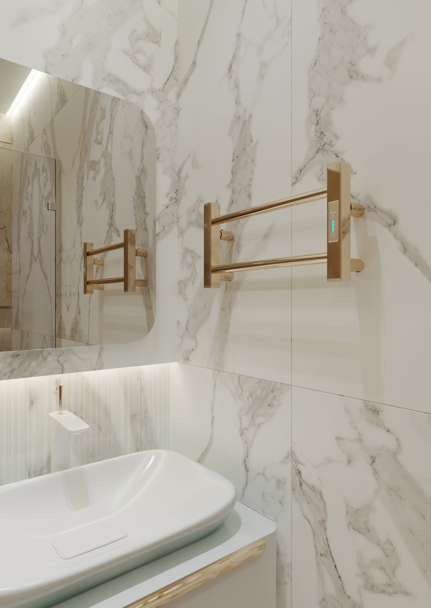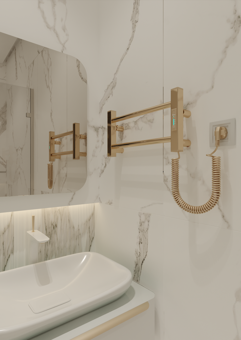 Ladder Lux elektrinis rankšluosčių džiovintuvas – stilingas ir funkcionalus sprendimas kiekvienai voniai. Šis elektrinis įrenginys pagamintas iš nerūdijančio plieno ir padengtas aukštos kokybės PVD titano nitrido danga, kuri sukuria ilgaamžį apsauginį sluoksnį. PVD technologija užtikrina ne tik atsparumą, bet ir puikų estetinį rezultatą. Veidrodinis paviršiaus blizgesys ir šiltas aksominis aukso atspalvis suteikia gaminiui prabangos pojūtį bei puikiai dera prie modernaus ar klasikinio vonios kambario interjero.